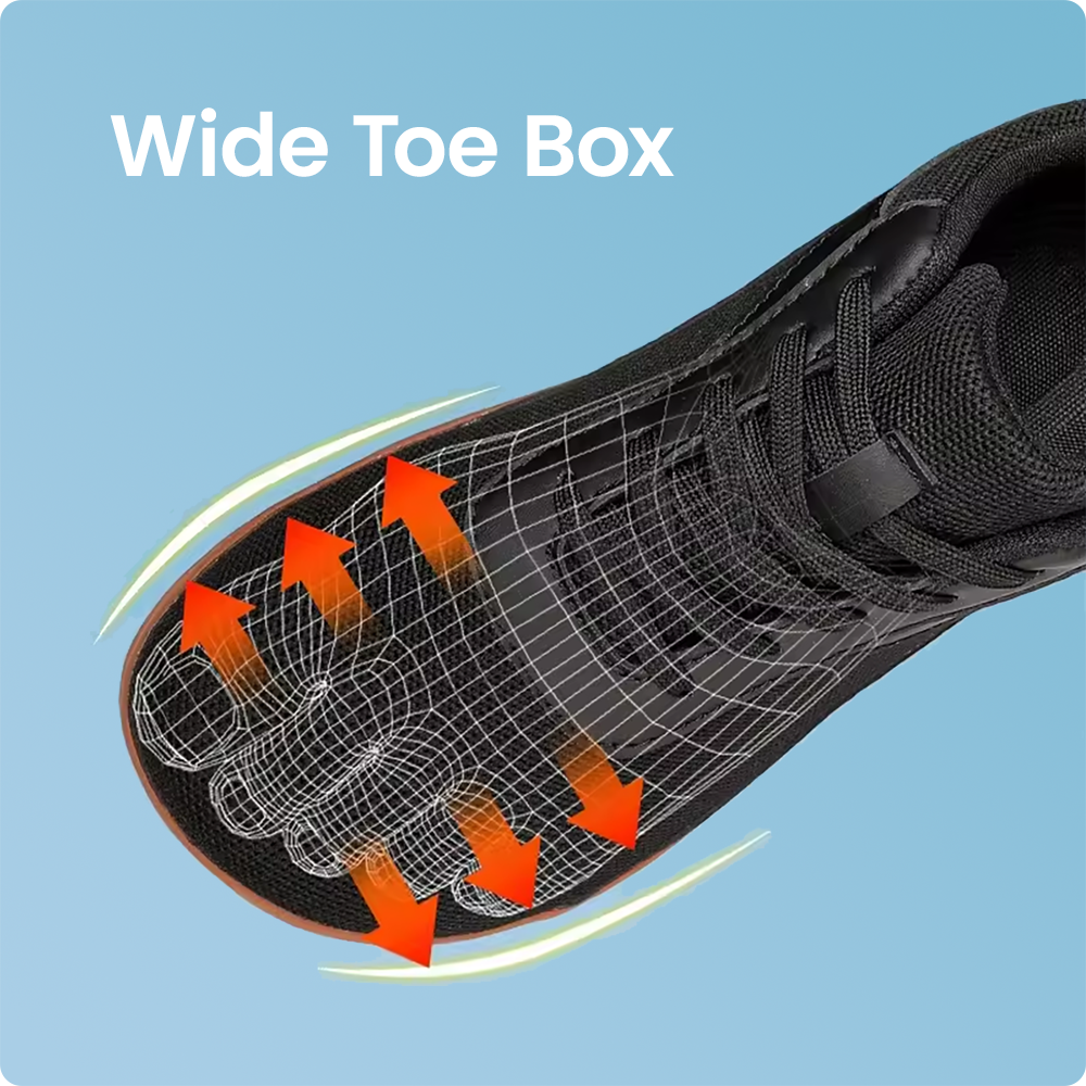 Spacious Toe Box - The generous toe box, combined with the flexibility of barefoot shoes, allows the toes to move and spread naturally, fostering foot strength and flexibility.