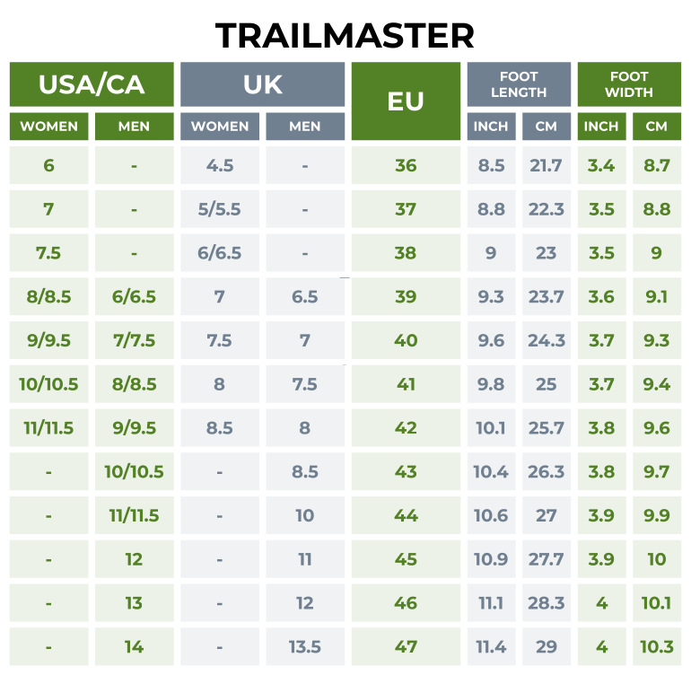 | USA/CA Women | USA/CA Men | UK Women | UK Men | EU | Foot Length (inch) | Foot Length (cm) | Foot Width (inch) | Foot Width (cm) |